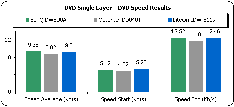 In the front panel there are from left to right, the DVD dw800a logo, BenQ logo, and the CD rewritable logo, all on the loading tray. For the reading test we used 24x Ultra Speed rewritable media from Mitsubishi Chemicals.